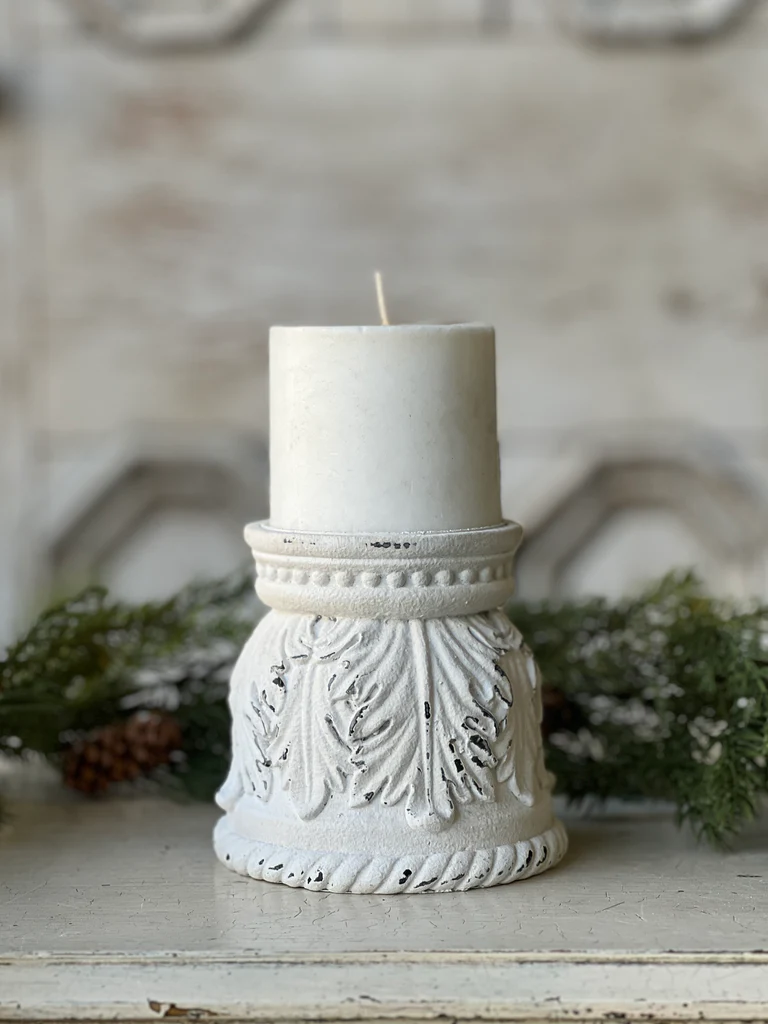 The Relevare Candle Holders are beautifully detailed with their distressed finish and give vignettes an element of elegance. This is perfect to use with a candle or you can flip it over and then it functions as a base to use with other decor. This is perfect for the use with florals too! Please note this is only for the candle holder. Other decor pictured not included.