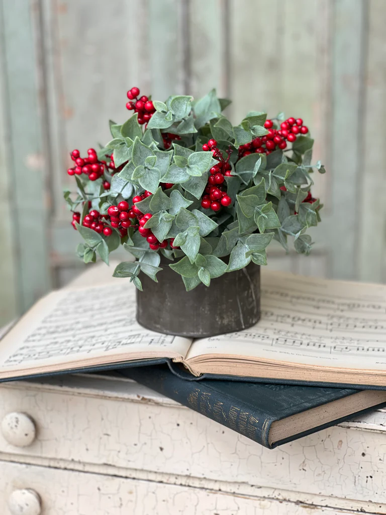 Broad textured eucalyptus leaves are dashed with sprigs of striking berry clusters that are the perfect complements to one another and are sure garner attention.